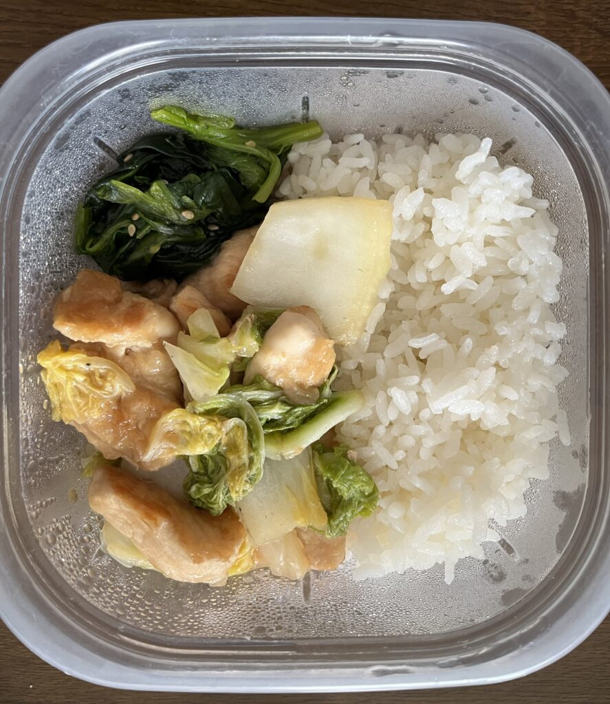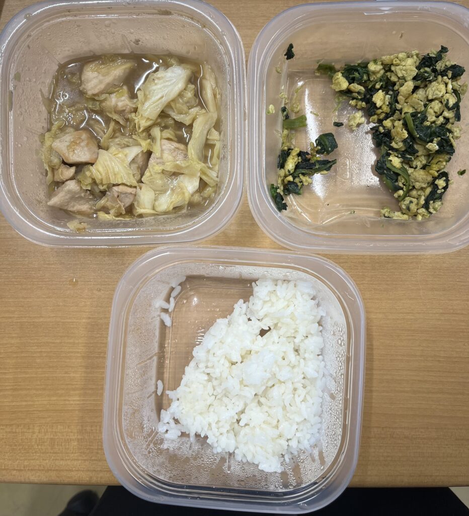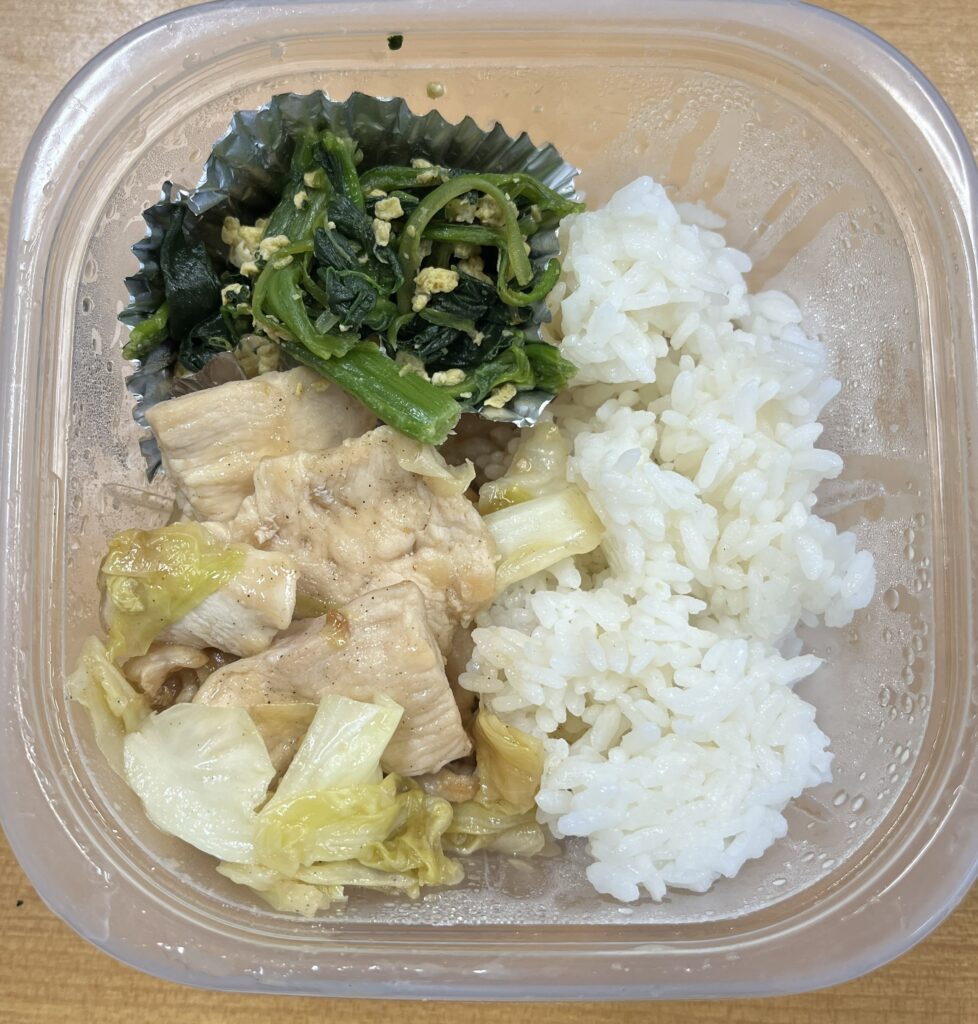 2日目は「むね肉キャベツのポン酢炒め」と「ほうれん草と卵の炒め物」を詰めたパック弁当を作りました。