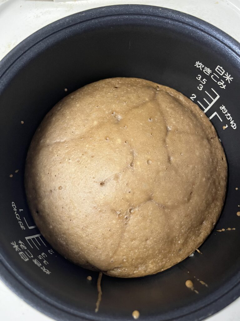 生地の間に板チョコを入れるのですが、それがほんのりとろけてとても美味しかったです!下の画像が炊飯器で炊けた直後のパンです!焼きたてはとてもふわふわでしたがとろけました。やっぱりパンは焼きたてが最強ですね!