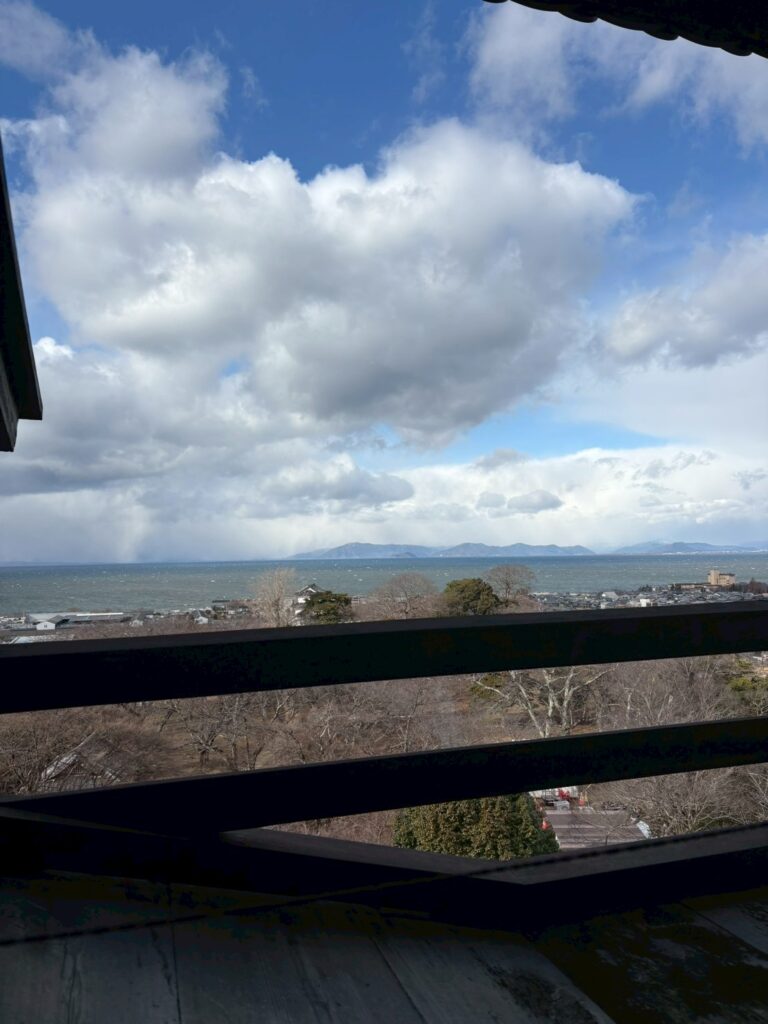沢山の階段(崖?)を登って来たので城からの景色はきれいでした!琵琶湖も見られましたよ。